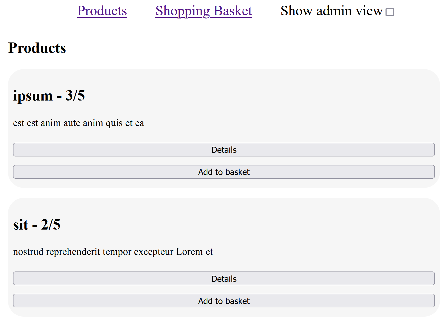 Een product bestaat uit de naam van het product, de gemiddelde rating gemeten over alle reviews heen en de shortDescription. Tenslotte zijn er 2 knoppen aanwezig, de eerste knop wordt gebruikt om naar de detailpagina te gaan, de tweede knop wordt gebruikt om het product toe te voegen aan het winkelmandje. Hiervoor kan je gebruikmaken van de functie addProductToBasket uit het bestand shoppingBasketAPI.js.