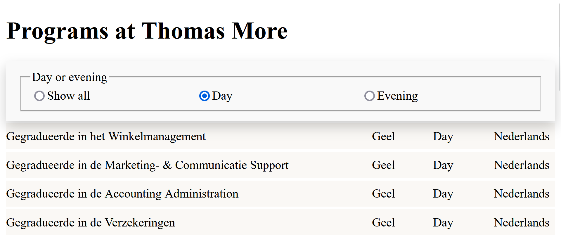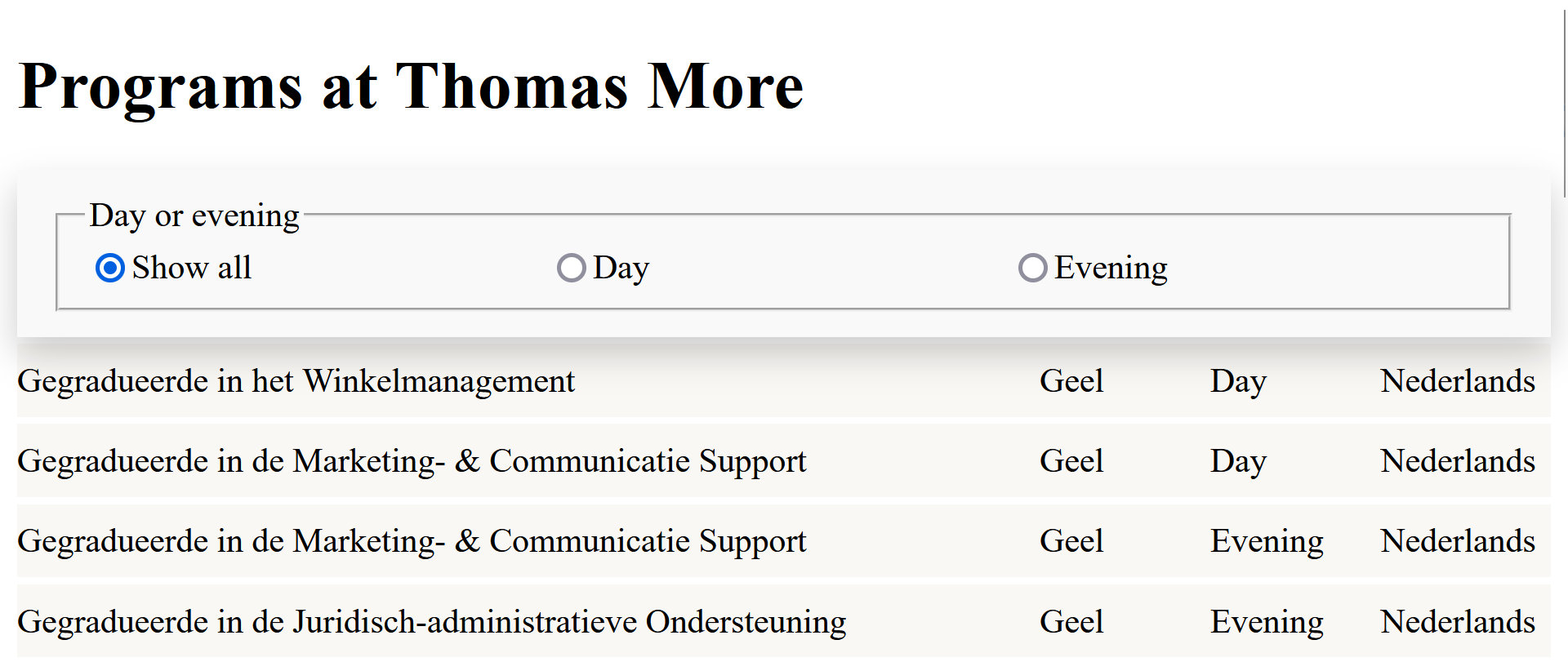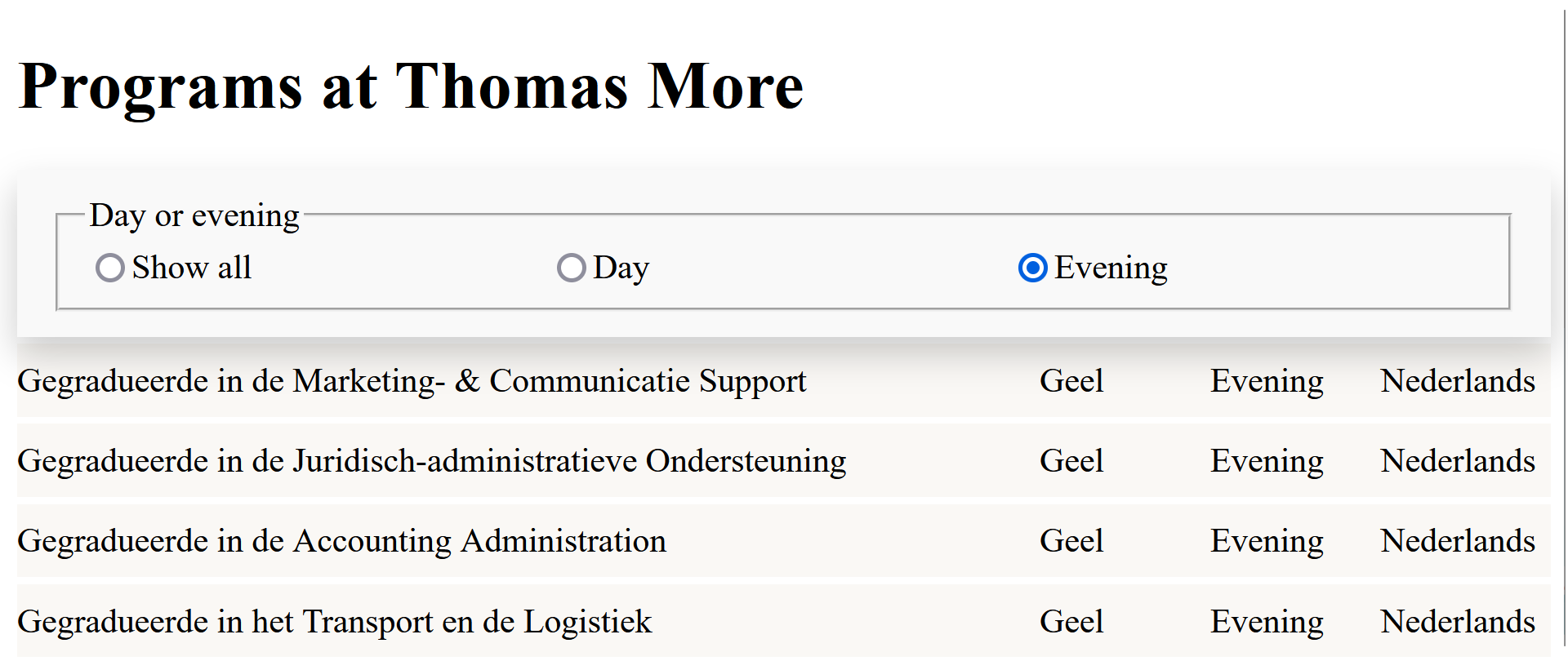 De component moet natuurlijk ook werken, als je een All/Day/Evening selecteert moeten enkel de relevante opleidingen getoond worden. Maak opnieuw gebruik van de getAllMatchingPrograms functie, dit keer met een gepaste waarde voor de day parameter.