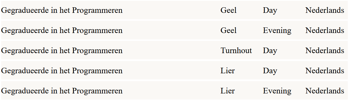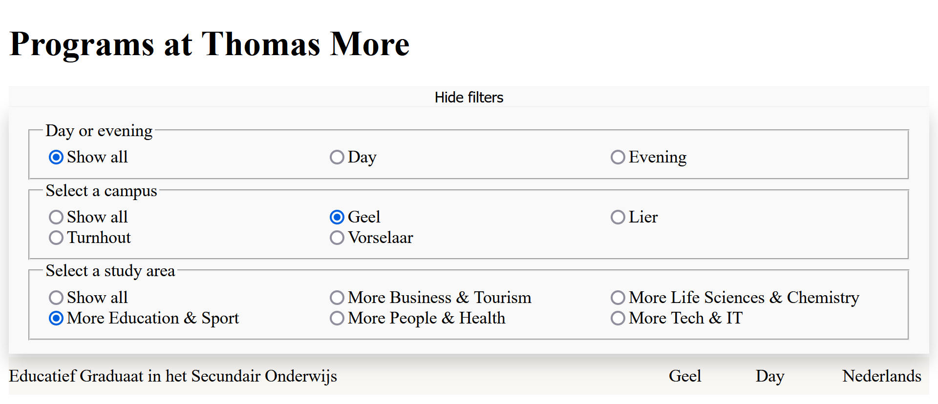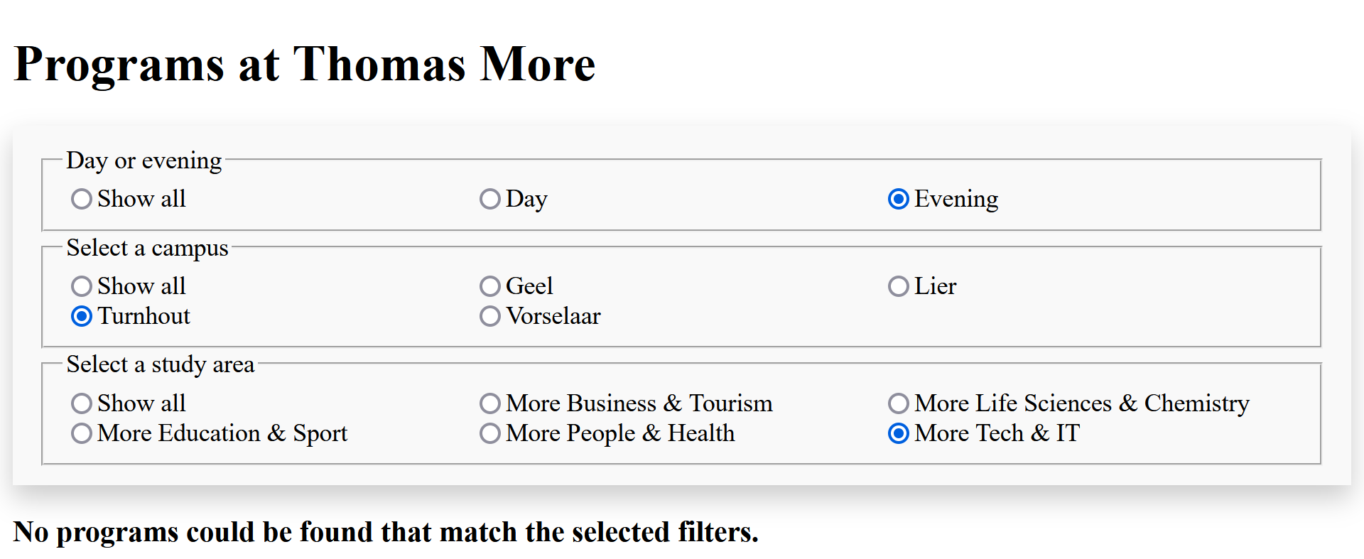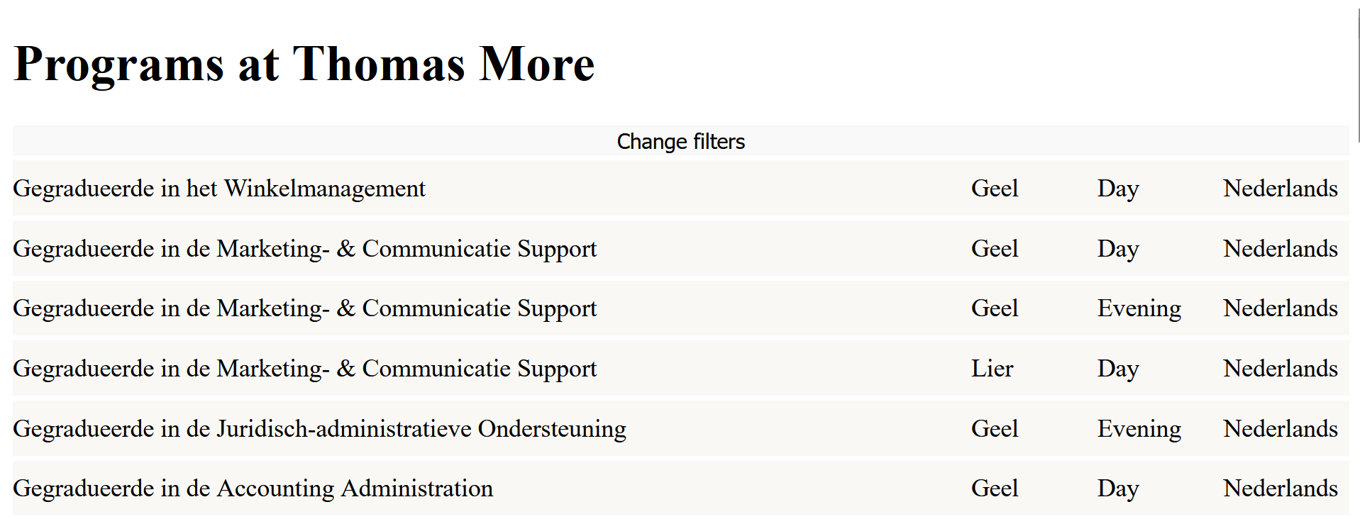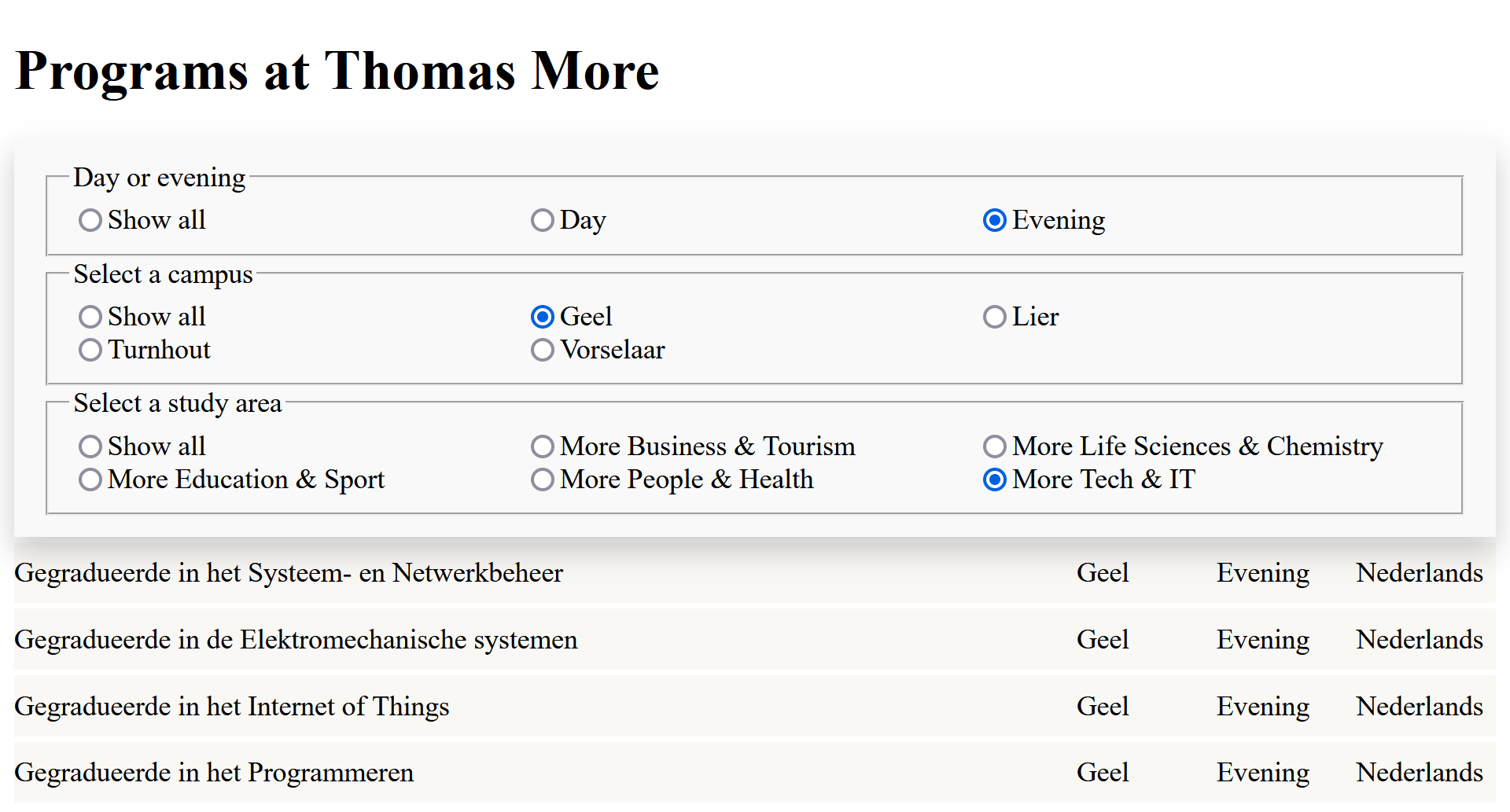 Tijdens dit examen bouw je een UI waarmee de verschillende graduaat en bacheloropleidingen binnen Thomas More Kempen bekeken kunnen worden. Je voegt de optie om deze opleidingen te filteren op basis van het studiegebied, de campus en of het over een dag of avondopleiding gaat.