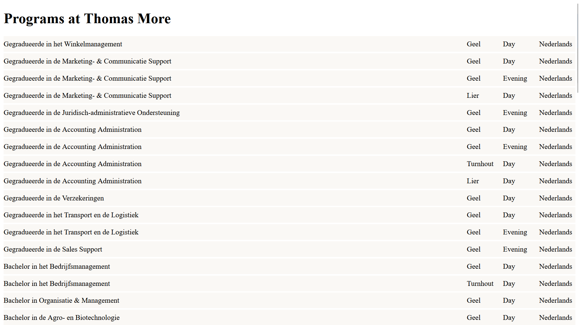 Zorg ervoor dat de ThomasMore component onmiddellijk getoond wordt als de applicatie start. Breid de ThomasMore component uit zodat alle opleidingen die beschikbaar zijn binnen Thomas More toont. Maak hiervoor gebruik van de getAllMatchingPrograms functie die beschikbaar is in de startbestanden (/src/API/thomasMore.js). De parameters van deze functie mag je voorlopig nog op undefined zetten.