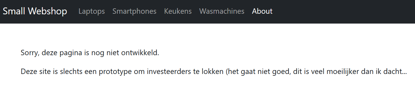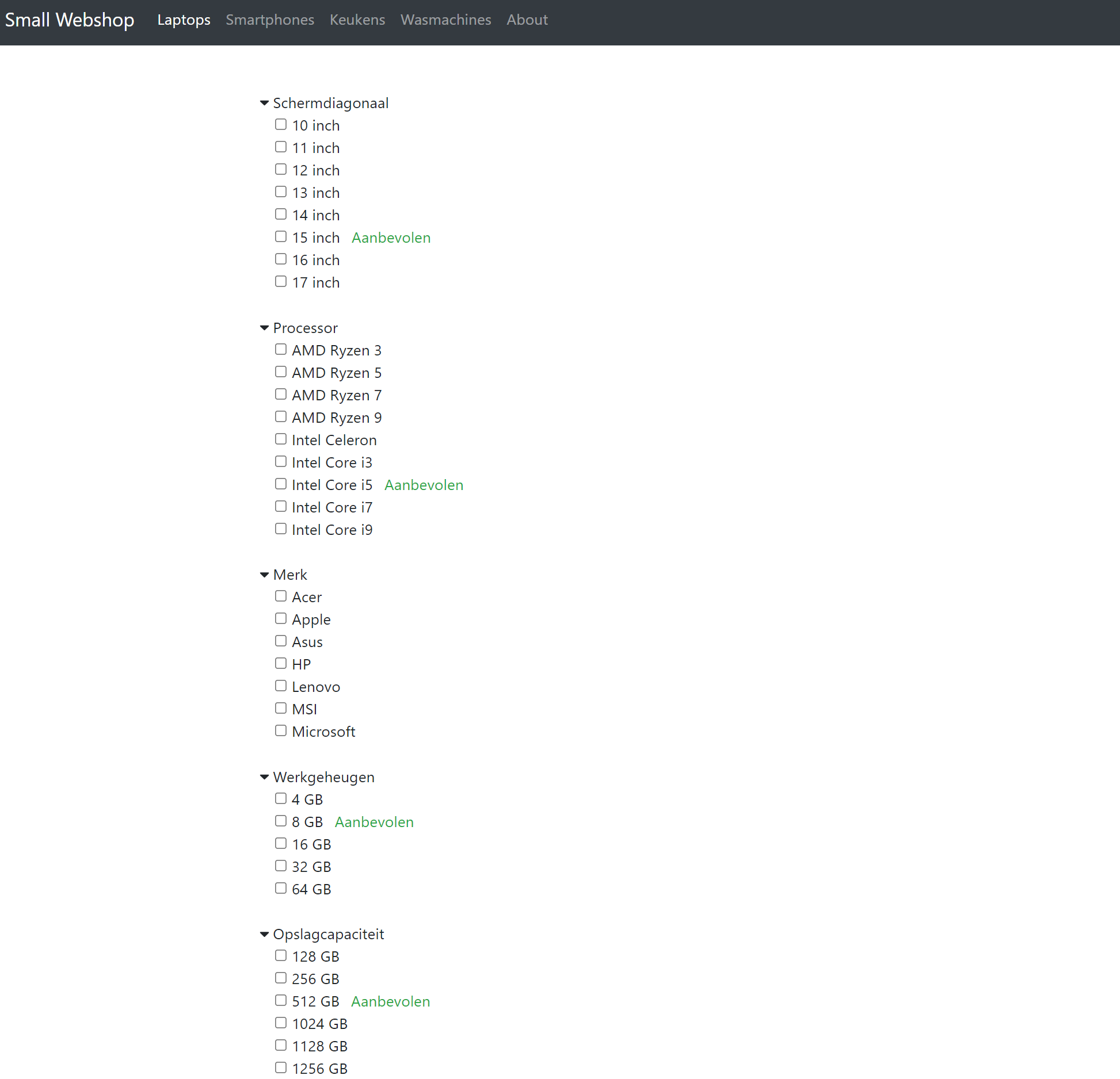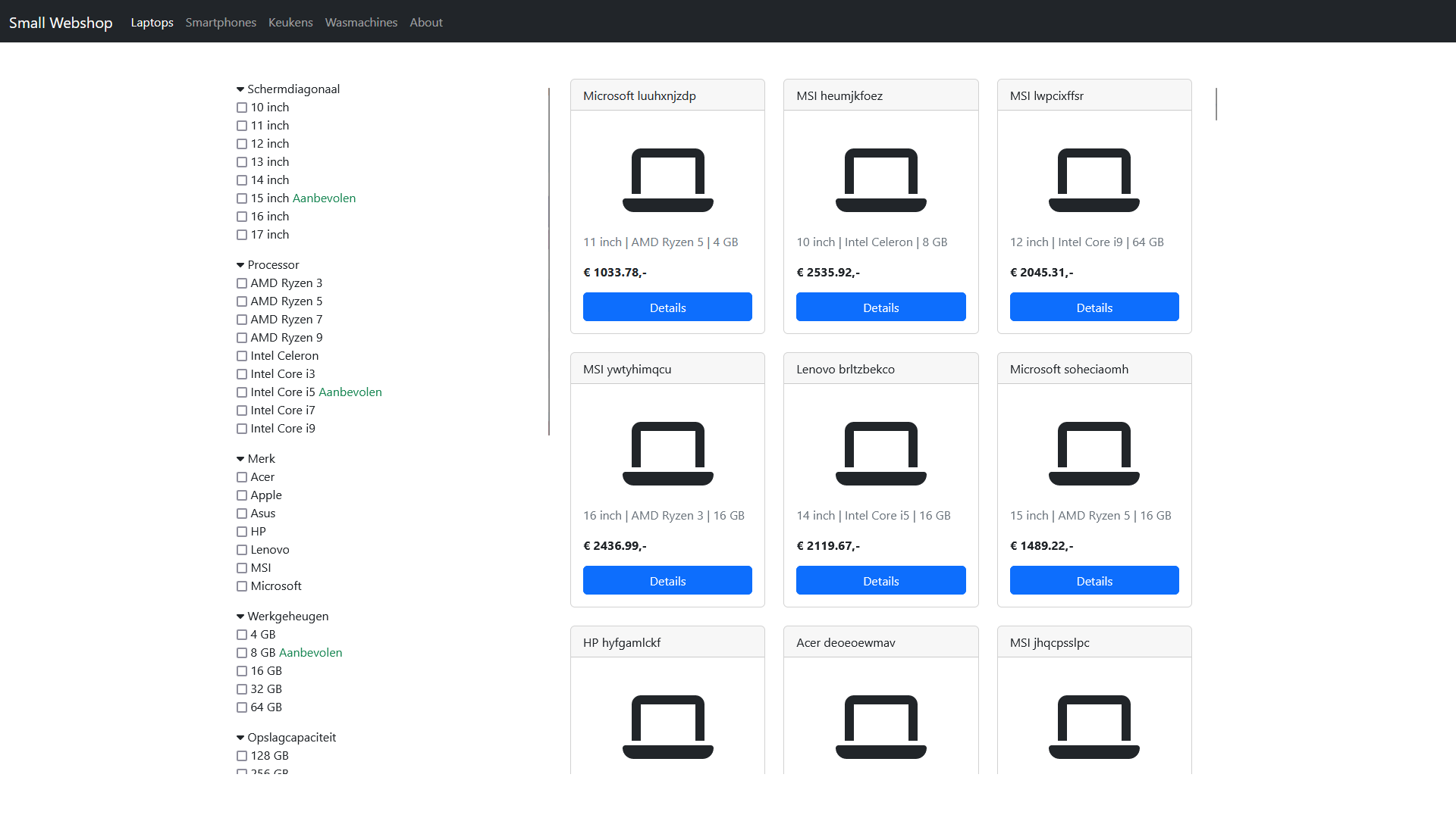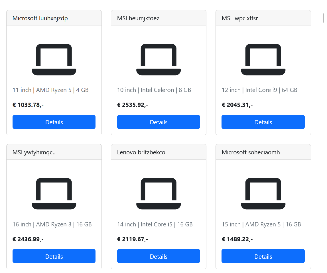 We bouwen een webshop pagina met een aantal laptops, waarvan de specificaties automatisch gegenereerd zijn. De website stelt de gebruiker in staat om de beschikbare laptops te filteren op basis van deze specificaties en om een detailpagina te bekijken.