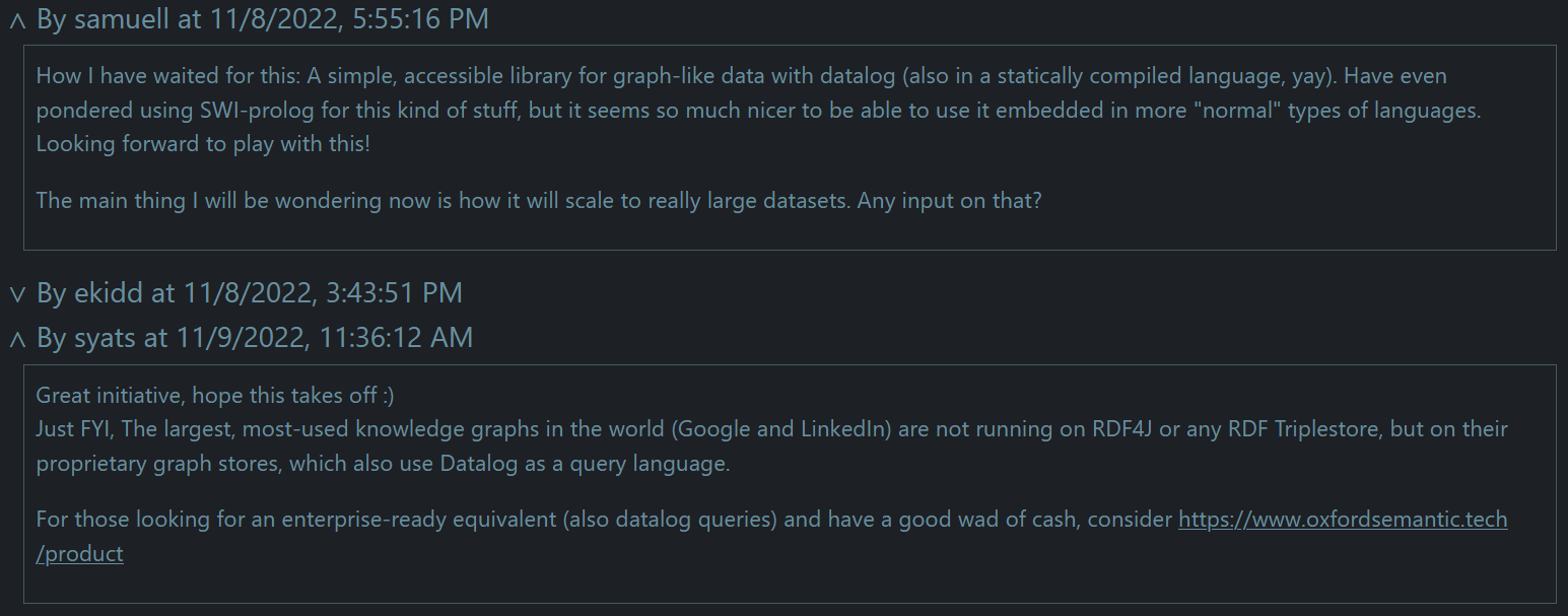 De niveau 1 commentaren worden opgehaald voordat de pagina getoond wordt. De commentaren kunnen open en dichtgeklapt worden, je kan gebruik maken van de HTML-entiteiten ∧ (∧) en ∨ (∨) om aan te geven of de commentaar open of dichtgeklapt is. Om de datum van de commentaar correct weer te geven, moet de unix timestamp (in seconden) die je van de API terugkrijgt geconverteerd worden naar een JavaScript timestamp (in milliseconden). De JavaScript timestamp kan meegegeven worden als argument aan de Date klasse (new Date(timestamp)). Tenslotte kan je de toLocaleString() gebruiken om een goede representatie te krijgen (op basis van de locale instellingen in de browser).