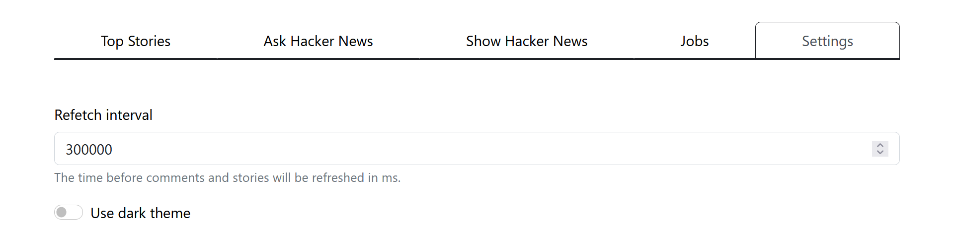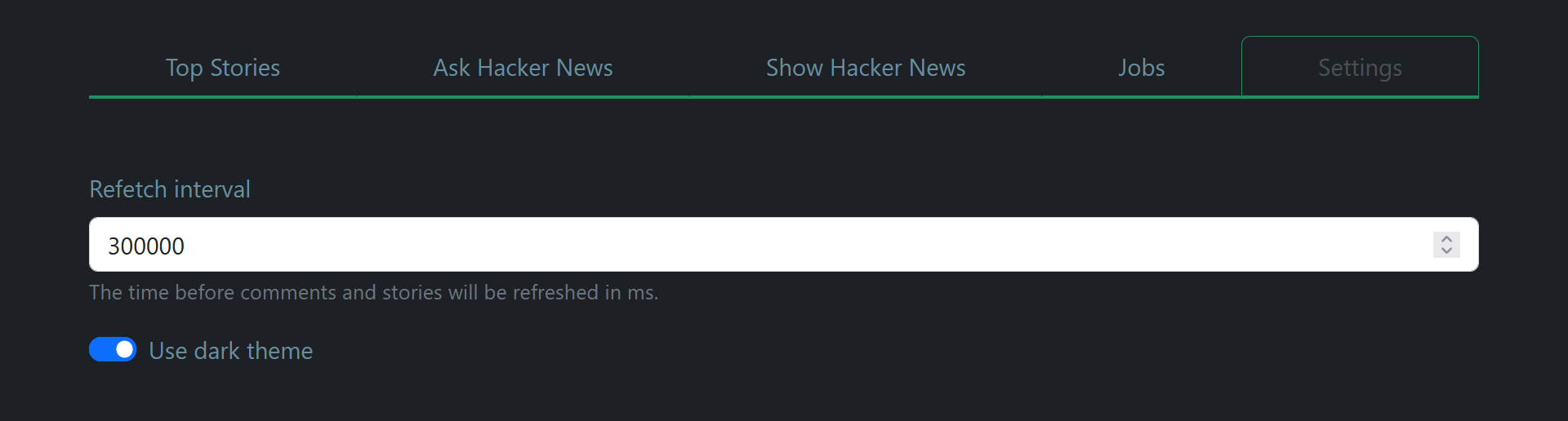 Maak een nieuwe context aan. Deze context bevat een variabele darkTheme en refetchInterval alsook methodes om deze waarden aan te passen. De variabele darkTheme geeft aan of de gebruiker al dan niet gekozen heeft om het donkere thema te activeren (standaard true). De variabele refetchInterval geeft aan om de hoeveel tijd react query de data moet ververst worden. Voorzie een provider en zorg er vervolgens voor dat het refetchInterval gebruikt wordt in de useGetItemIds en useGetItem hooks.