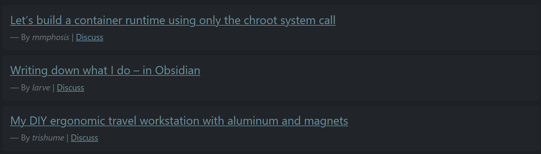 De stories zien er als volgt uit, de titel is een link naar de website waarover het story gaat (als deze er is), de discuss link verwijst door naar een detailpagina voor het story. Raadpleeg de documentatie voor meer informatie over de exacte property namen. Onderstaande component is gebouwd met behulp van een Card.