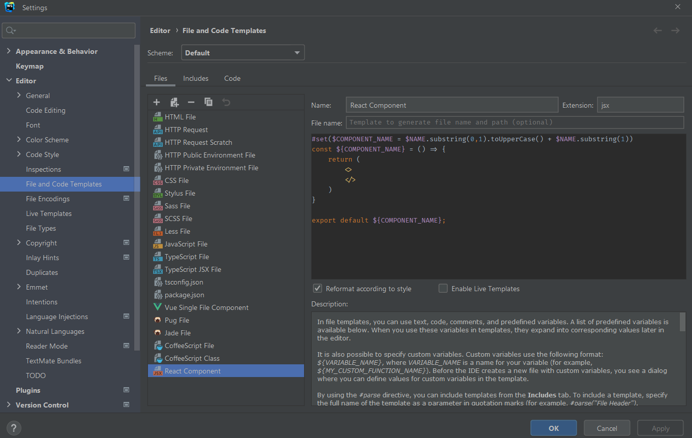 Navigeer vervolgens naar Settings > Editor > File and Code Templates en voeg hier een nieuwe template toe. Plak onderstaande code in je template.