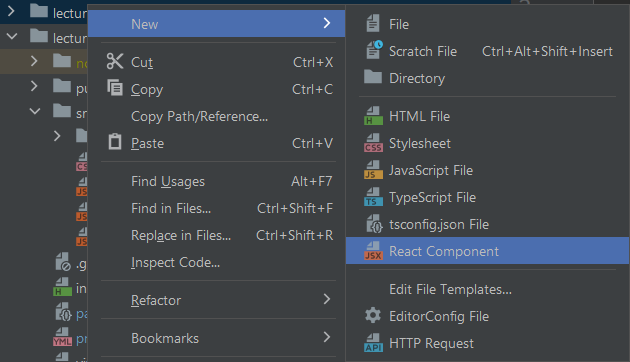 Nu zou de optie beschikbaar moeten zijn om een nieuwe React component aan te maken via het "New File" menu.